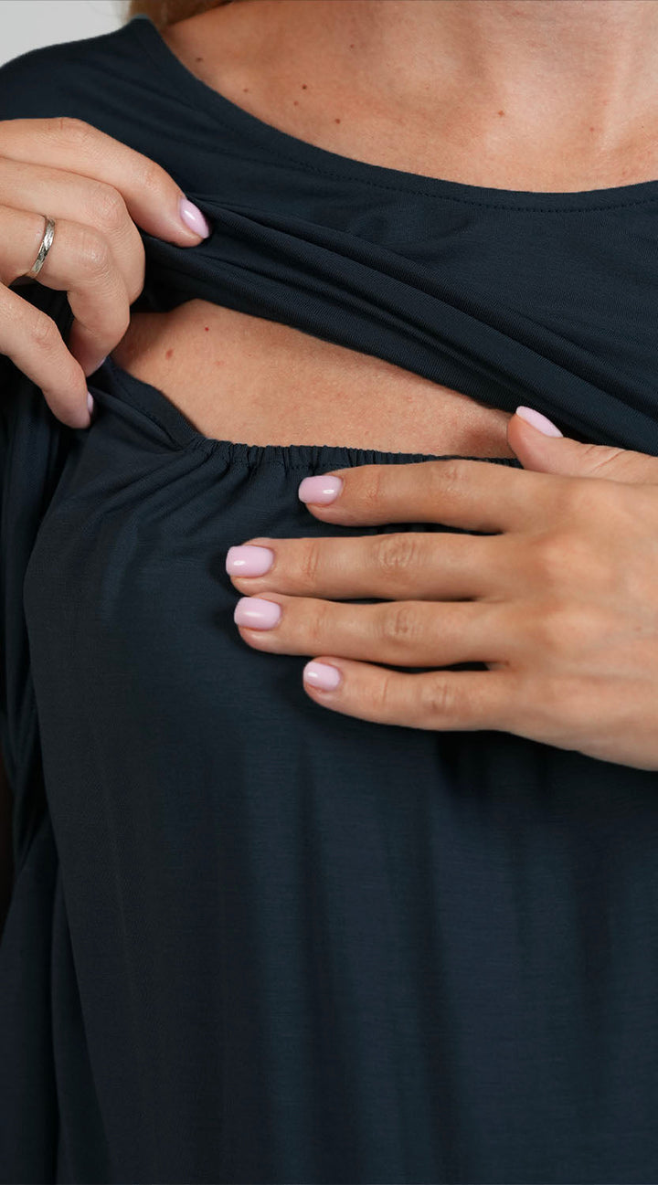 The minimalist silhouette flatters every stage of motherhood, while the discreet dual-layered front panel makes breastfeeding on the go easy, mess-free, and stress-free. Whether you’re lounging at home, heading to brunch, or doing errands with baby in tow—this dress has you covered.